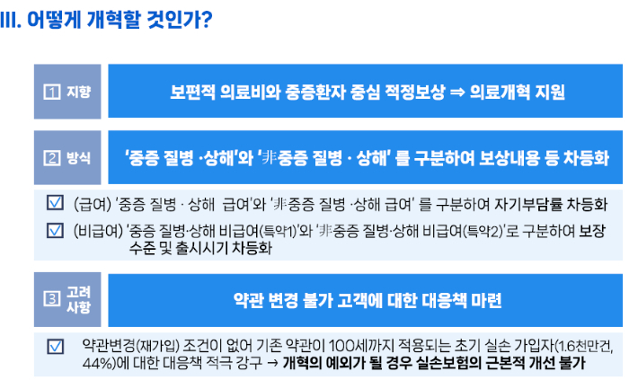 그래서 정부에서는 실손보험 개편안을 내놓으면서 과잉진료도 막고 제도를 더 효율적으로 관리한다는 취지죠. 이번 개편은 과잉 진료 억제 뿐아니라 비급여 항목을 관리 체계로 편입해서 투명성을 높이는걸 중점으로 한다고 해요.